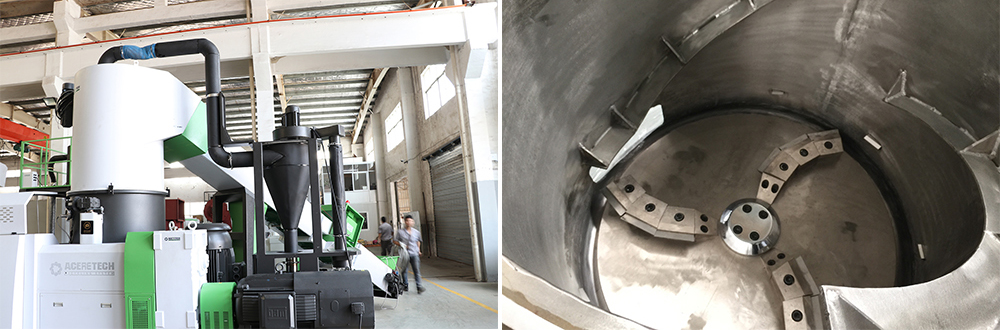 碎膜进入压实机后,电机带动压实室底部的动刀转动。 安装在压实室壁上的旋转动刀和固定刀形成切削力并产生摩擦热。 摩擦热导致薄膜收缩。 压实室壁上的导流板将物料向下压实,刀盘转动产生的离心力将收缩膜送入挤出机螺杆;