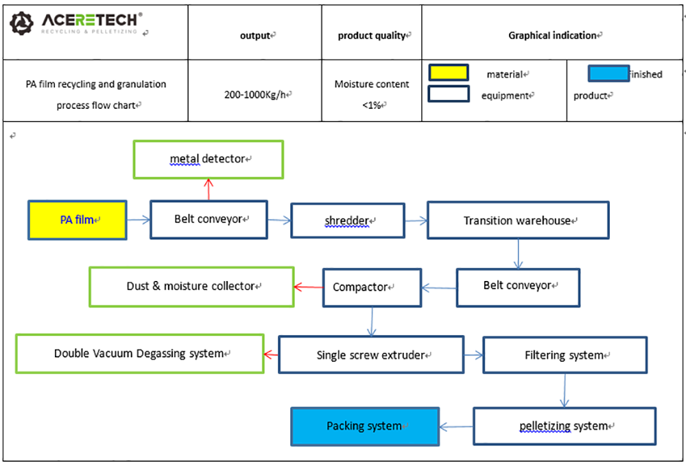 由于PA薄膜具有较高的机械强度,在造粒前需要用粉碎机将其尺寸预缩。 尺寸一般为60-80mm。