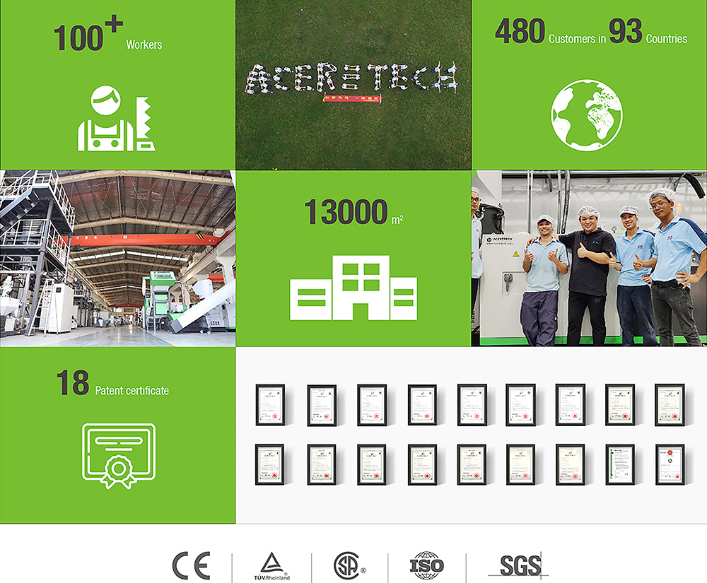 自2015年ACERETECH成立至今已有六年。ACERETECH MACHINERY专注于塑料回收、清洗和造粒。 超过 800 台挤出机、撕碎机、破碎机和洗衣机已出口到 93 多个国家。 它为全世界的塑料回收行业做出了卓越的贡献。