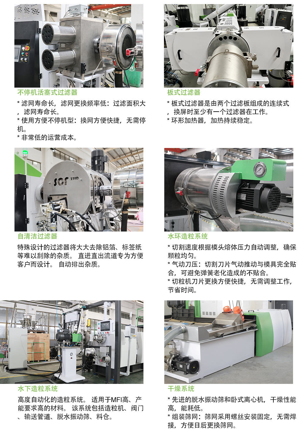 设备包括带式输送机/牵引喂料装置、压实机、带双区真空脱气系统的单螺杆挤出机、过滤器、水环切粒系统/水下切粒/水条切粒系统/水下切粒系统、干燥机、 产品筒仓和电柜控制系统。